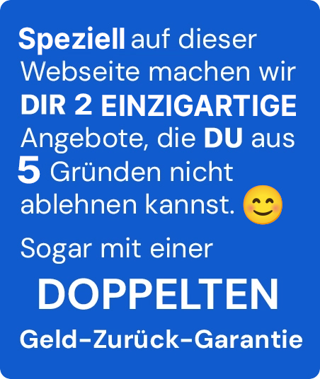 3️Es ist die günstigste und ehrlichste Form der Marktbeobachtung – denn unser Anspruch ist klar: Wir wollen stets die Besten sein – in Inhalt, Qualität und Herzblut. Daher ist der Hinweis, wenn es etwas Besseres gibt, Gold wert. Und wir bezahlen Dir GERN 😊 das DOPPELTE zurück, wenn wir uns dadurch verbessern können